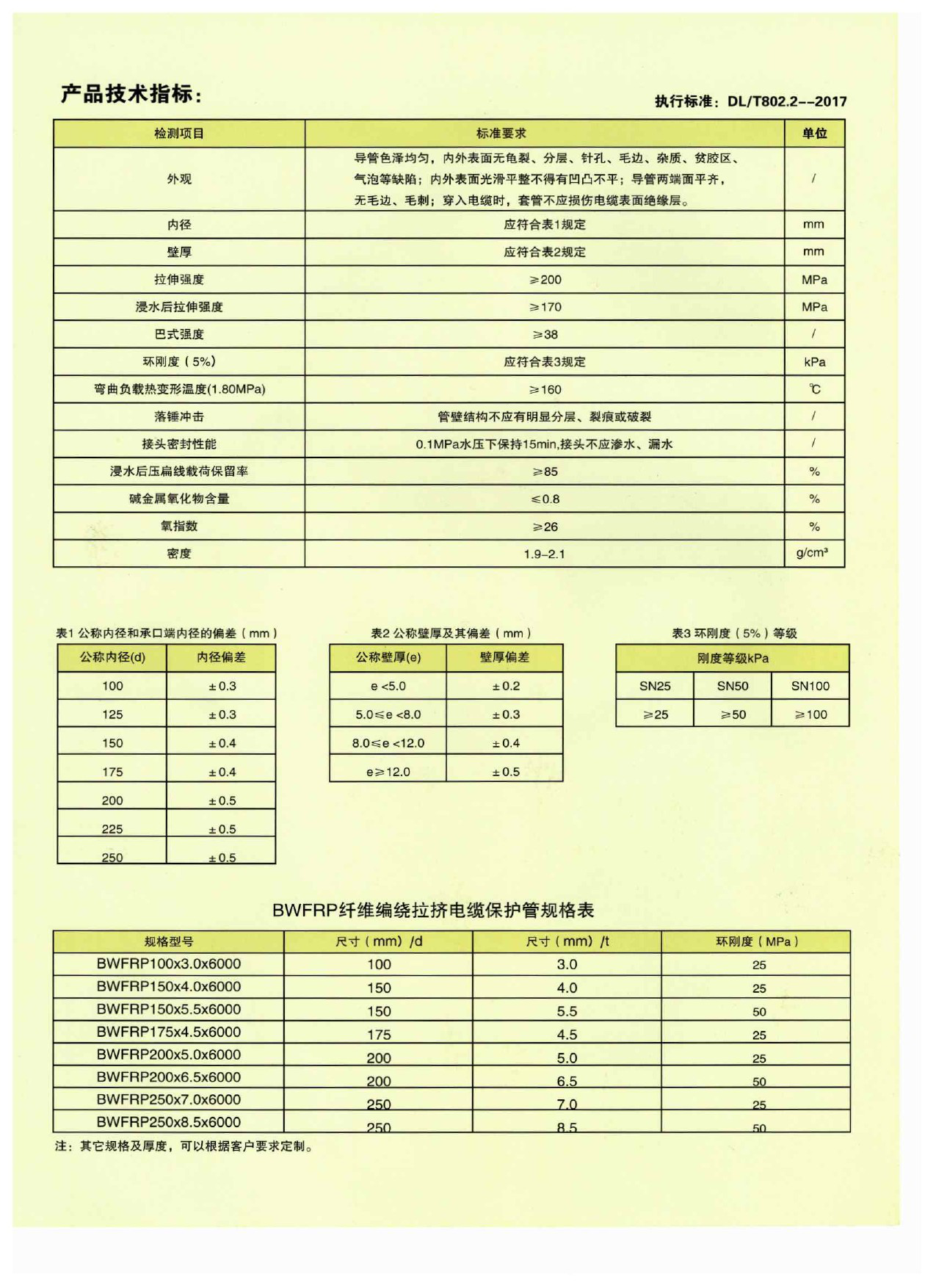 纖維編繞拉擠電纜保護管(BWFRP)規(guī)格型號: