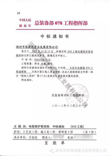 2012年12月,深捷通管業(yè)成功中標(biāo)中國人民解放軍總裝備部海南078工程電纜保護管材料項目,數(shù)量將近20萬米,金額將近1000萬元。2016年6月獲得海南文昌發(fā)射場建設(shè)貢獻獎。