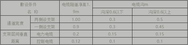 (3)電纜溝、電纜隧道內(nèi),支架層間垂直距離和通道寬度不應(yīng)小于下表所示數(shù)值。