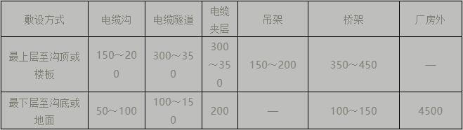 (5)電纜支架最上層及最下層至溝頂、樓頂或溝底、地面的距離,當(dāng)無設(shè)計(jì)要求時(shí)按下表要求。