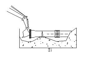 2.7對(duì)直徑小于1500mm的管道,可通過(guò)能跨地溝的挖掘機(jī)來(lái)插接。即在承口前面放置一塊或若干塊相當(dāng)?shù)哪举|(zhì)墊板保護(hù)管道端面,以防被挖掘機(jī)吊頭碰傷。然后旋轉(zhuǎn)吊頭使其緊貼墊板并推動(dòng)管道使承插口連接。(見(jiàn)圖9)
