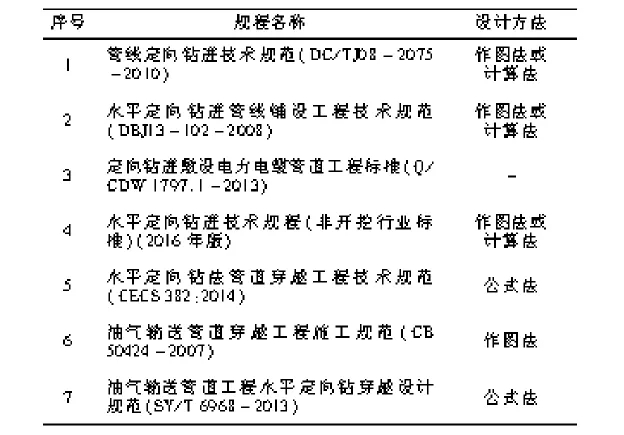 對(duì)于定向鉆進(jìn)管線的軌跡設(shè)計(jì)方法,主要采用的是作圖法或計(jì)算法,對(duì)可供電力電纜定向鉆進(jìn)軌跡設(shè)計(jì)的7個(gè)規(guī)程規(guī)范的設(shè)計(jì)方法進(jìn)行歸類比較,詳見表1。