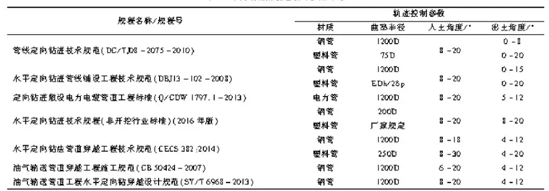 對(duì)于定向鉆進(jìn),其軌跡控制參數(shù)主要包括了曲率半徑、入土角度、出土角度等關(guān)鍵參數(shù),而這些參數(shù)的取值與管道的材質(zhì)息息相關(guān),通過對(duì)前述7個(gè)規(guī)程的對(duì)比,詳見表2。